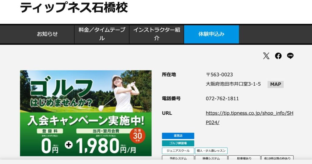 | レッスン内容 | ティーチングプロによるパーソナルレッスン。スイング分析機器でフォームを可視化し、スマホでいつでも確認できる |